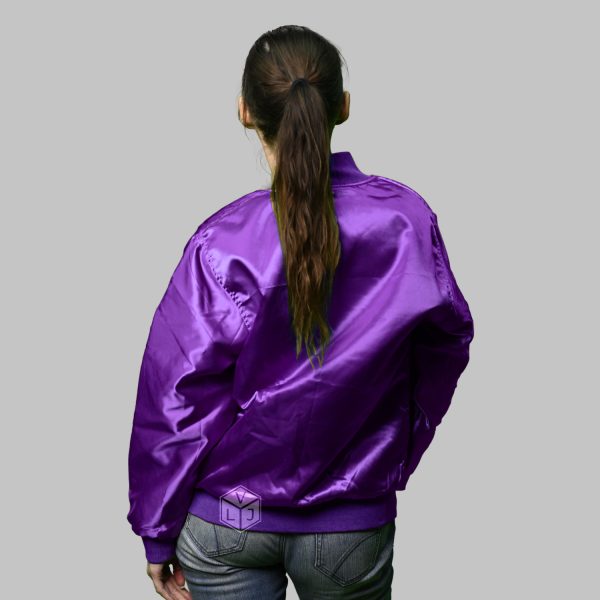 Bomber Jackets Women are made of the world’s finest materials Satin Polyester body and sleeves purple. We use a fluffy 200 GSM inside center and a plain polyester fabric lining. 100% acrylic cotton ribbing is used on the collar, cuffs, and waistband in purple color. We use the best quality Brass zipper on the front closure and sleeve pocket, two varsity snaps are used on the front pocket closure of purple.