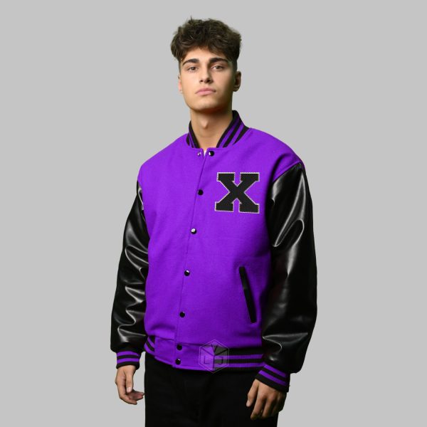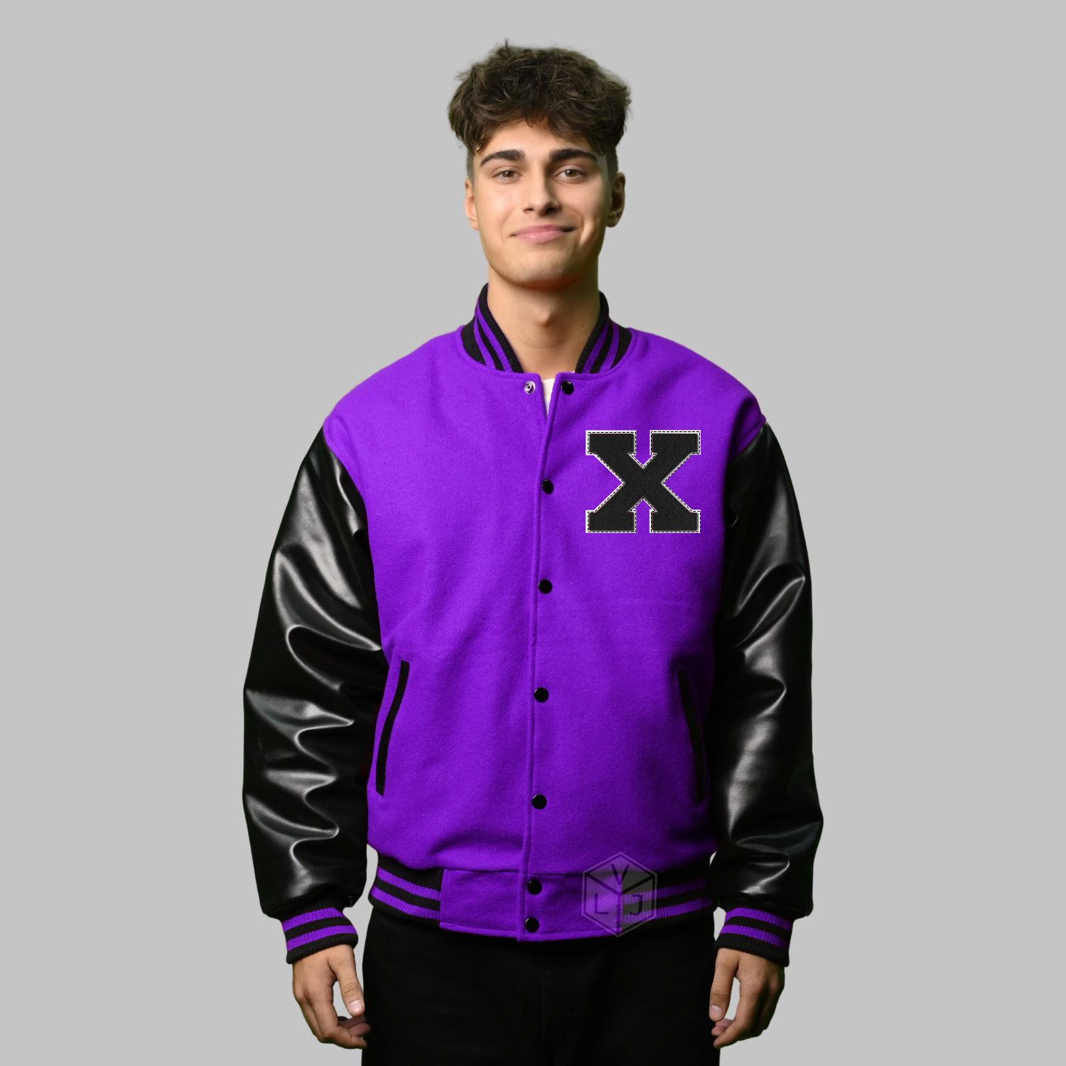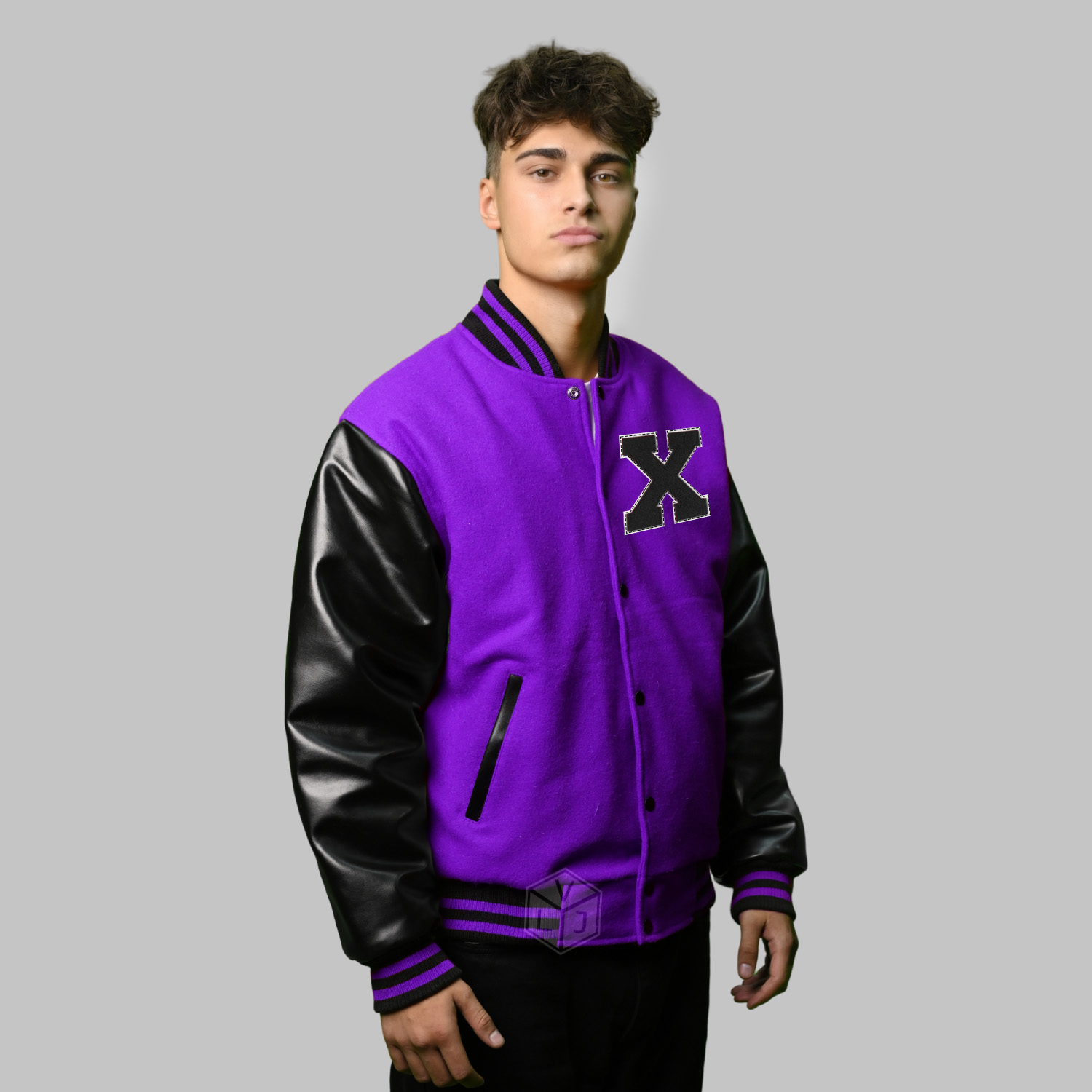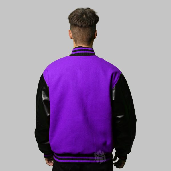 Varsity Men Jacket produced in World’s best high quality combination of materials, wool body color Purple and sleeves color Black. Buy this varsity jacket for men/women as it is or you can design your own jacket through our design tools.